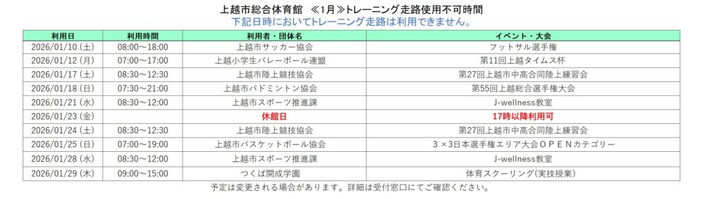 2025年12月19日 / 最終更新日 : 2025年12月19日 上越市総合体育館「トレーニング走路」「卓球場」「柔剣道場」の利用ができない日・時間〈令和8年1月〉 令和8年1月の「トレーニング走路」「卓球場」「柔剣道場」の利用ができない日・時間です。 ダウンロードはこちら👇 1月走路ダウンロード ダウンロードはこちら👇 1月卓球場ダウンロード ダウンロードはこちら👇 1月柔剣道場ダウンロード