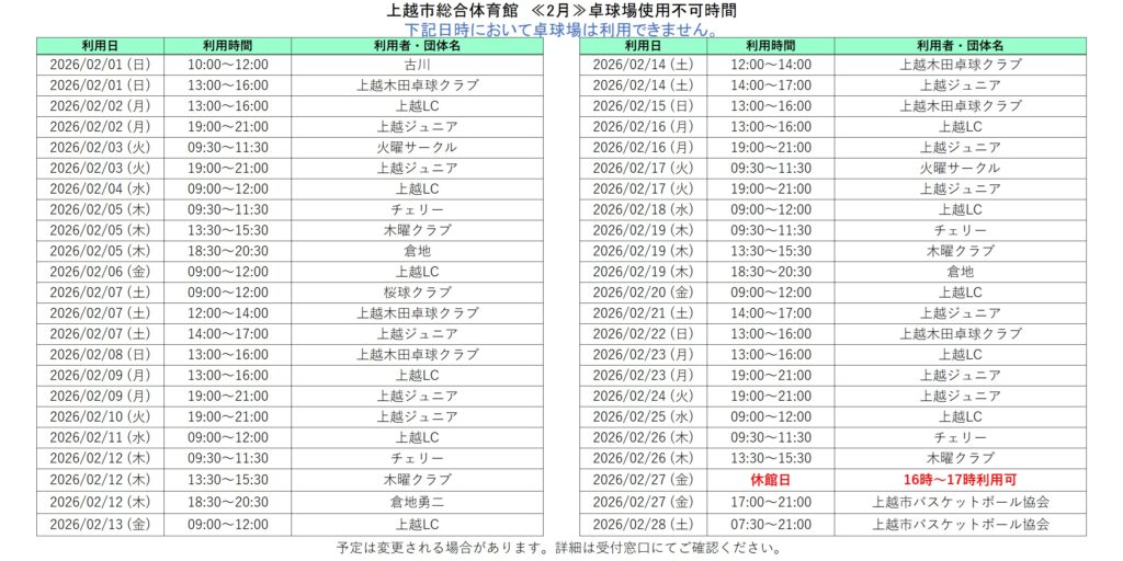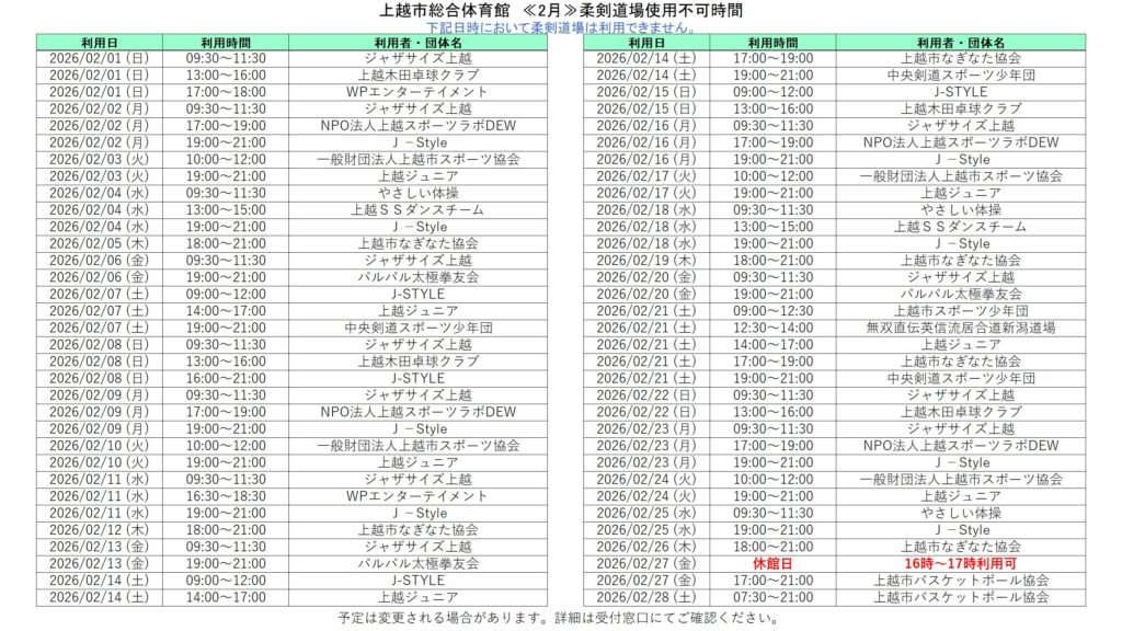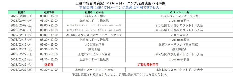 2026年1月26日 / 最終更新日 : 2026年1月26日 上越市総合体育館「トレーニング走路」「卓球場」「柔剣道場」の利用ができない日・時間〈令和8年2月〉 令和8年2月の「トレーニング走路」「卓球場」「柔剣道場」の利用ができない日・時間です。 ダウンロードはこちら👇 2月走路ダウンロード ダウンロードはこちら👇 2月卓球場ダウンロード ダウンロードはこちら👇 2月柔剣道場ダウンロード